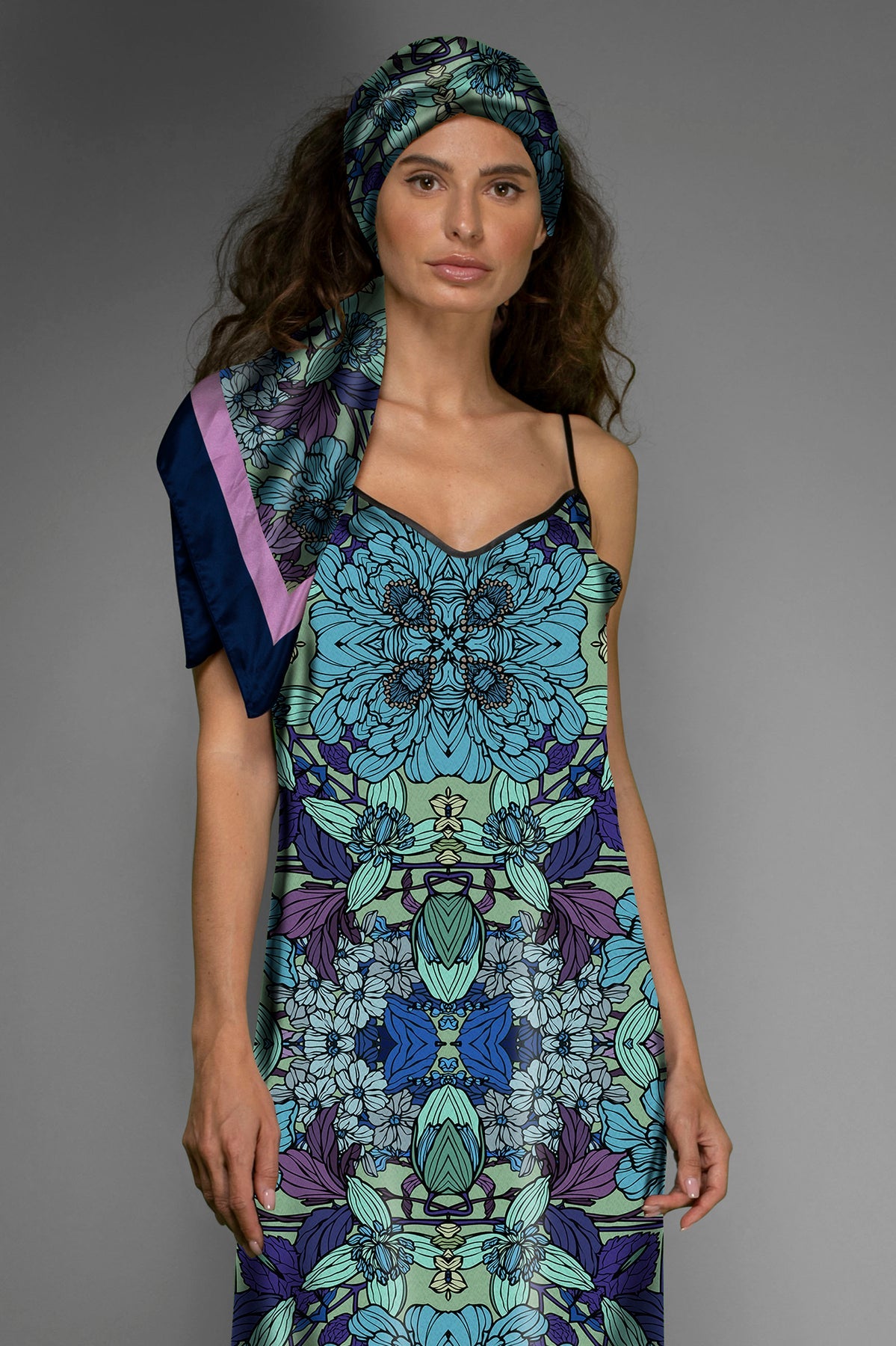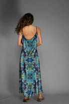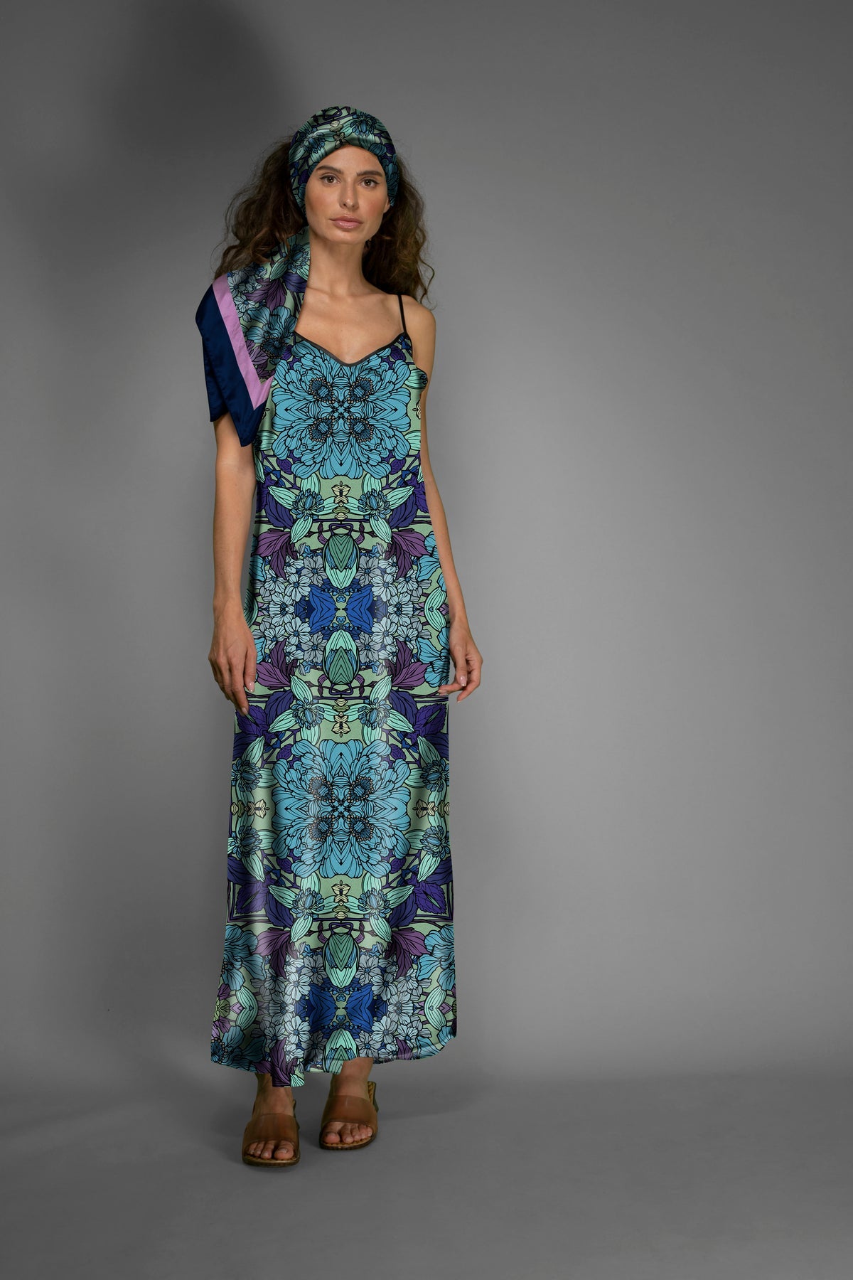 Slip into this fabulous silky Nuvula Blue Floral Slip Maxi Dress Handcrafted in super soft satin. This new Nuvula print development takes up inspiration from old designs, culturally-rich patterns, and futuristic color palettes to create a beautiful amalgam of art patterns. Take a deep dive with these incredibly deep colors.  Wrap yourself in vibrant flowers and feel ultimate renewal.