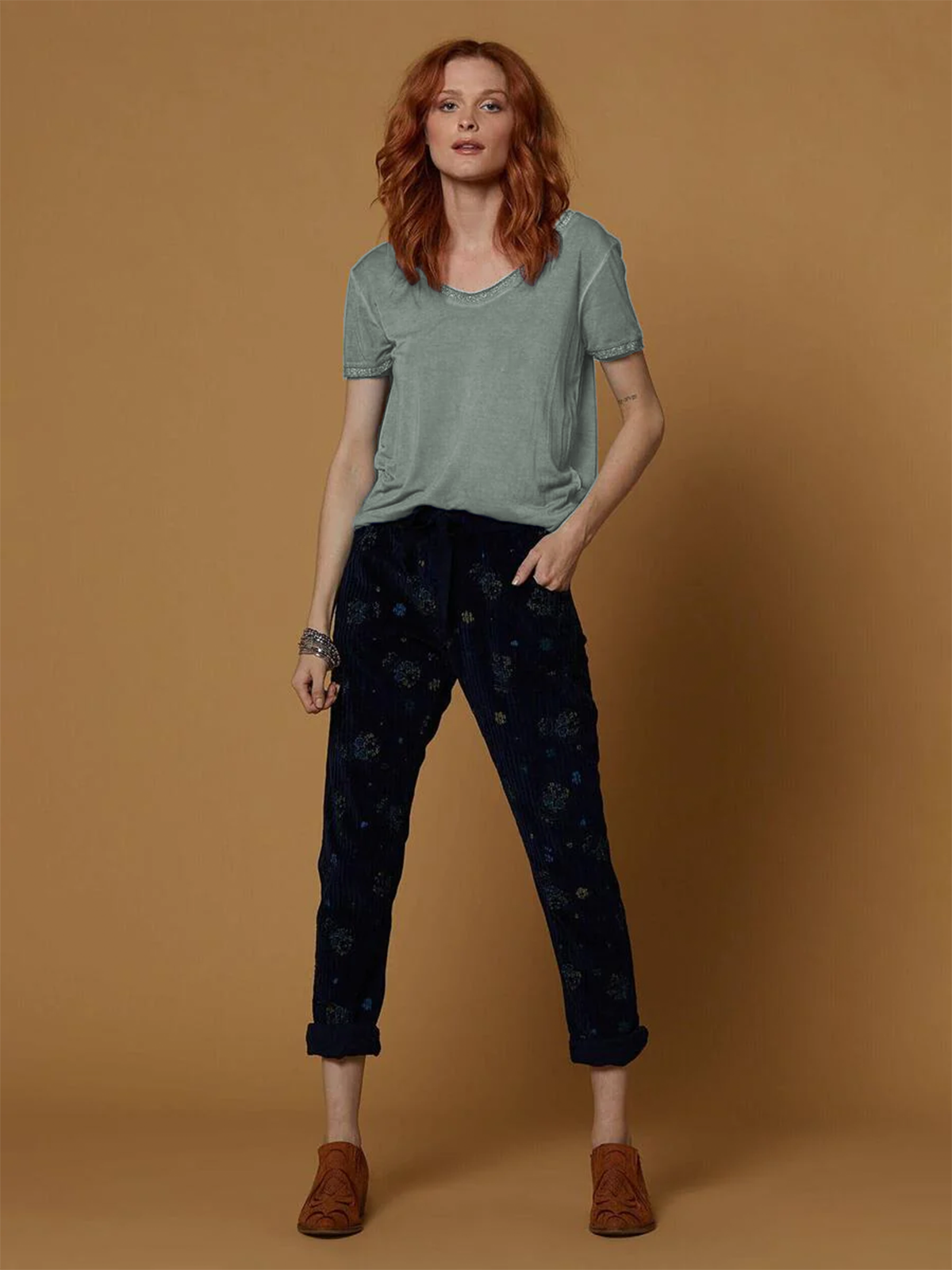 Introducing the LUISA Top with short sleeves, a chic update to the timeless tee. Prepare to be captivated by its unique charm. This extraordinary piece features delicate metallic shimmering thread along the v-neckline and sleeve trim, adding a touch of subtle allure. Crafted from lightweight, ultra-soft fabric, this top guarantees an exquisite sensation that will make you want to wear it everywhere you go.