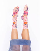Is it a sock, or is it art? This printed sock features abstract faces and modern shapes, adding an instant cool factor to your look. The feminine meets edgy color palette makes this style versatile enough to pair with everything from chunky clogs to heeled sandals. Made from silk-like nylon material for a smooth and seamless fit.