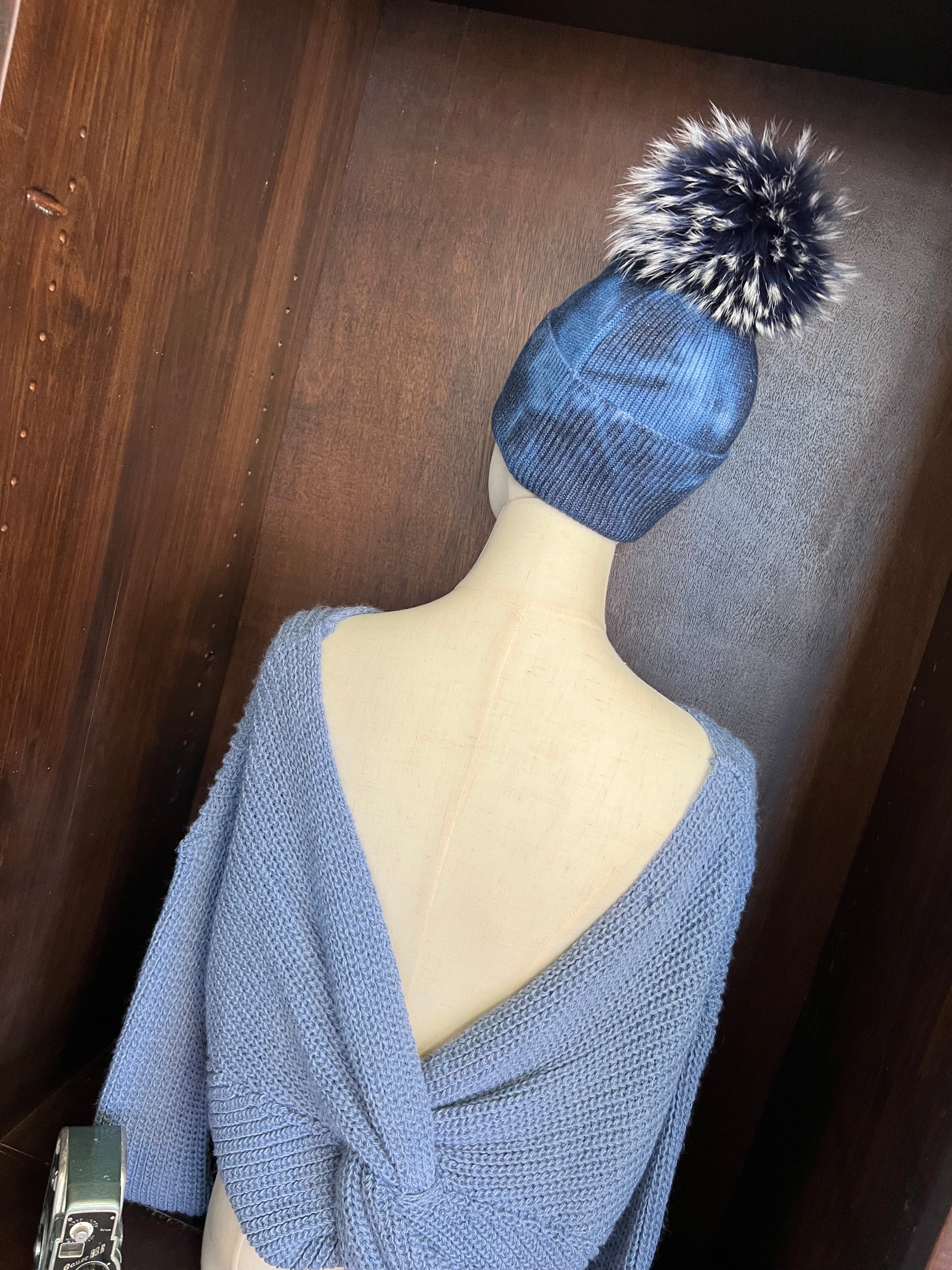 These Classic Toque Hats are each tie-dye dipped in blue (each hat is unique, and no 2 will be identical) and come with a real fur pom that snaps on top of the hat. Swap it out or take it off, the style is all yours! Pair this with our twisted knot sweater for the complete look.