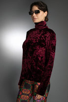 Indulge in the seductive hues of the '70s Nuvula style with this luxe Crushed Velvet Turtleneck in a deep burgundy color, featuring a classically fitted cut detail in an imaginatively mod silhouette.