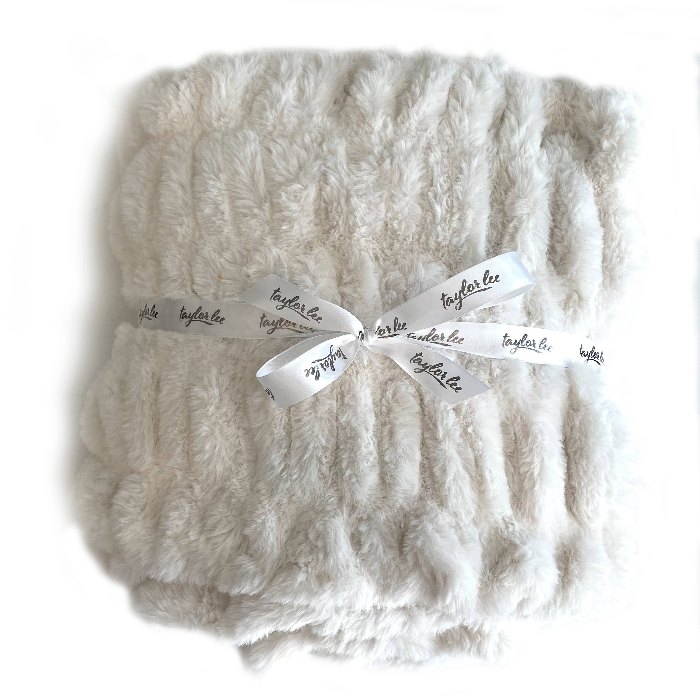 Crafted of a soft plush sculpted faux rabbit fur. So silky to the touch and cozy to snuggle into to create the ultimate comfort zone. Beautiful White/Light Ivory in color and comes rolled with two ribbons securing the blanket bundle.